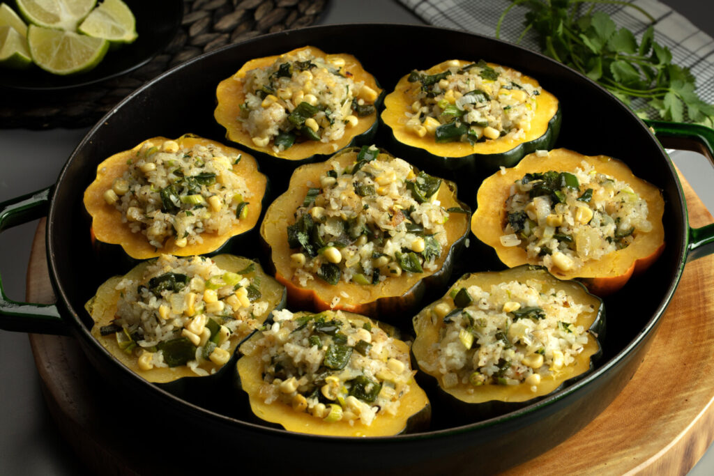 Stuffed squash makes a great meatless main course or elegant side to a roast chicken dinner. My favorite combination of rice, green chile, corn and cheese makes a terrific stuffing for acorn or delicata squash. I like the dark green vegetable flavor of poblano chiles in contrast to the sweet flavor of winter squash.