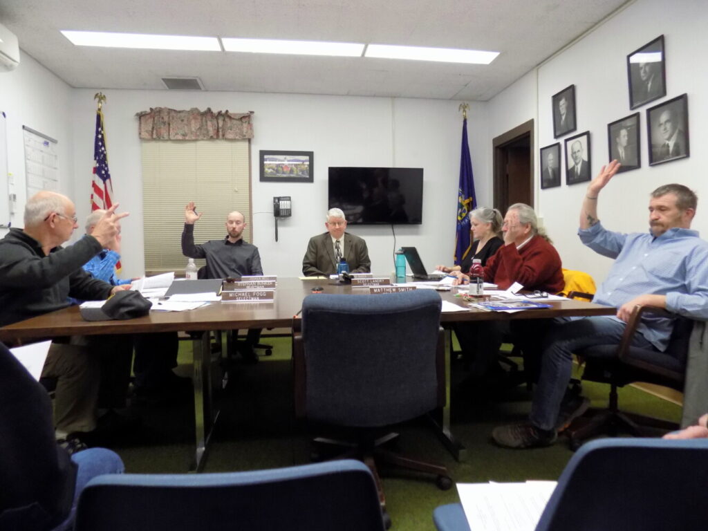 Farmington Selectmen approved a request from the University of Maine Farmington to incorporate town-owned land off Front Street into an adaptive multi-use trail system. Pictured from left during the vote are Selectmen Michael Fogg, Stephan Bunker (partially hidden) and Joshua Bell; Town Manager Richard Davis, Executive Secretary Nancy Martin and Selectmen Scott Landry and Matthew Smith. Pam Harnden/Livermore Falls Advertiser