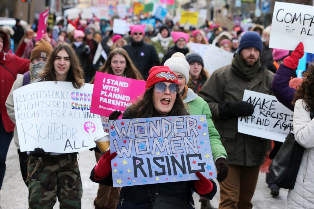 Several hundred women and their allies filled Congress Street in Portland on Saturday morning for the fourth annual Women’s March to demand equal rights for women and people of all backgrounds.
