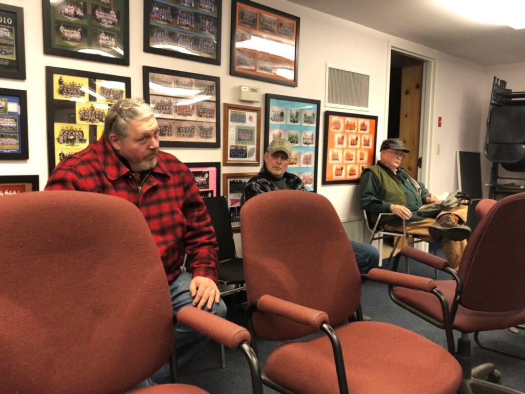 Bill Van Wickler, left, fire chief of Weeks Mills Volunteer Fire Department in China, questions the select board over conditions for disbursing stipend funds going forward at a meeting Tuesday evening. Dick Morse, far right, chief of the South China Volunteer Fire Department, also raised questions at Tuesday’s meeting, the first in several months that any fire chief has attended. Morning Sentinel photo by Meg Robbins