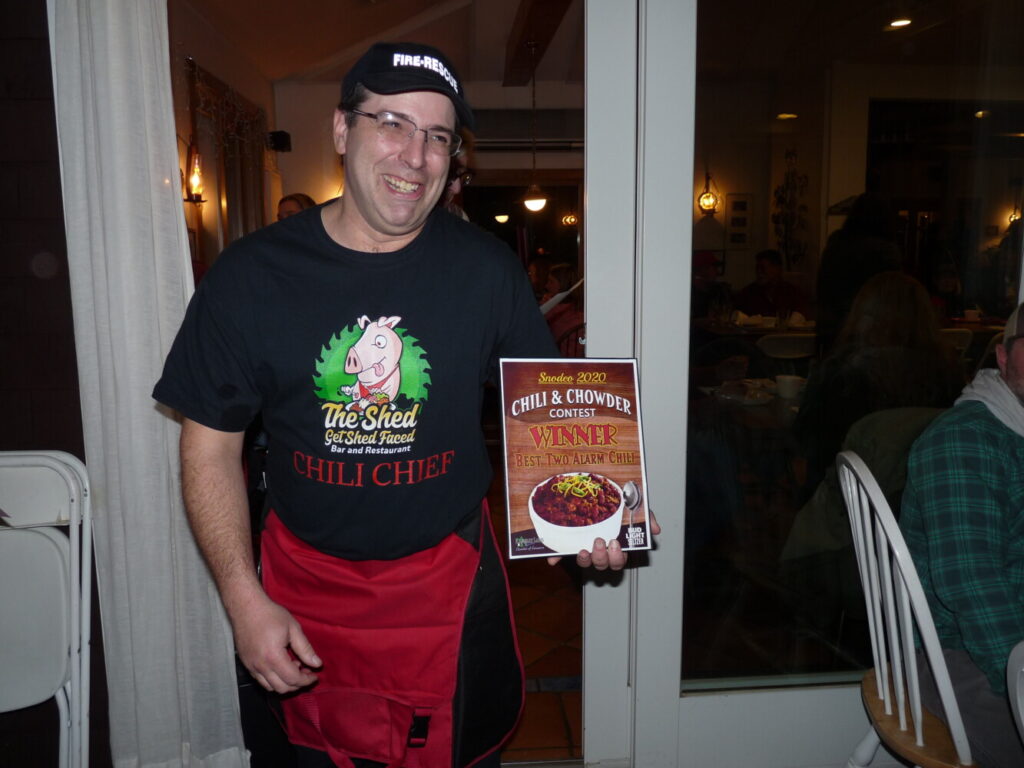 Rangeley Fire Chief Michael Bacon represents The Shed, which appropriately won Best Two-Alarm Chili on Thursday. Stephanie Chu-O’Neil/The Rangeley Highlander