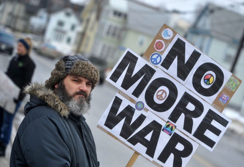 WATERVILLE — A small-but-committed group of protesters gathered Sunday morning outside the Universalist Unitarian Church of Waterville to stand in opposition to war.