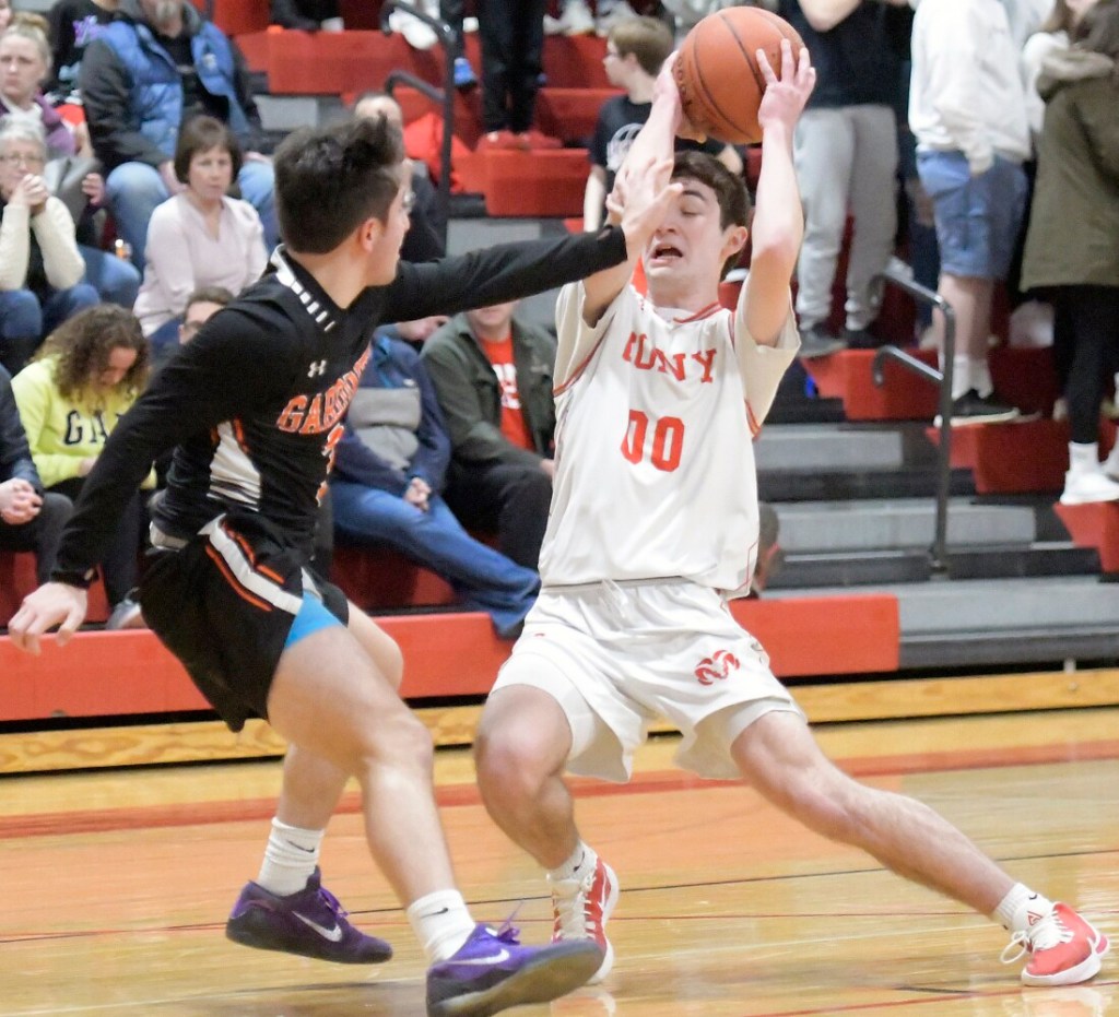Cony junior forward Jamal Cariglia shoots around Gardiner defender Ryan Moore during a Kennebec Valley Athletic Conference Class A game Tuesday in Augusta. Kennebec Journal photo by Andy Molloy Buy this Photo