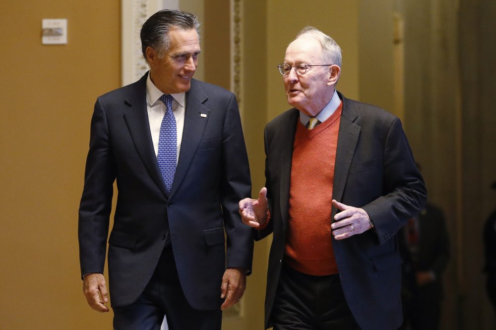 Sen. Mitt Romney, R-Utah, left, and Sen. Lamar Alexander, R-Tenn., return to the Senate chamber after a meeting in the majority leader’s office during a break in the impeachment trial of President Trump on Friday. Steve Helber/Associated Press