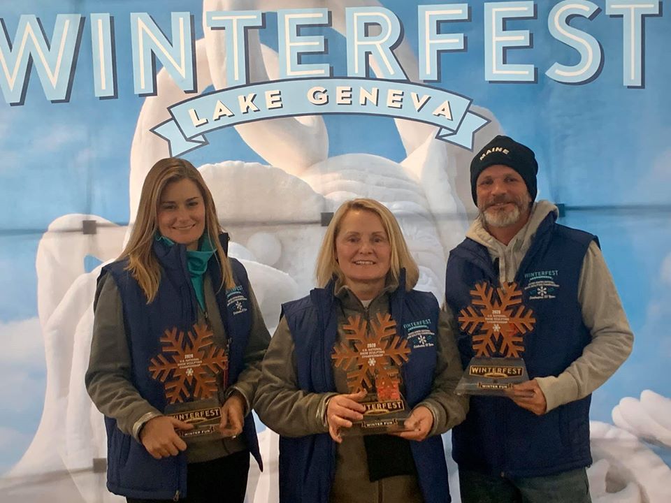 Amanda Bolduc of Skowhegan, left, Cathy Thompson of Madison and Bruce Peck of Florida took third at the U.S. National Snow Sculpting Championships on Saturday. Photo courtesy of Amanda Bolduc