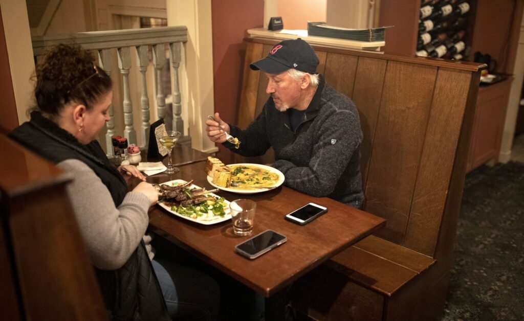 Over dinner at King Eider’s Pub, Heather and Chris Leeman, who are estate caretakers, said they could not participate in the pub’s phone challenge because they depend on their phones to alert them to any problems at the homes they look after. Brianna Soukup/Staff Photographer Buy this Photo