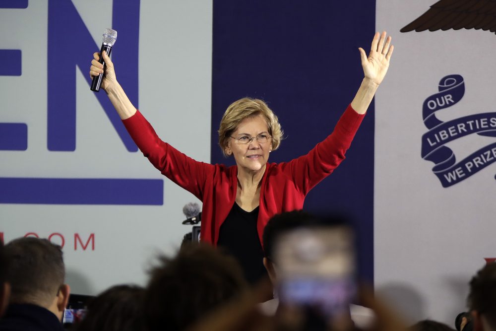 Democratic presidential candidate Sen. Elizabeth Warren, D-Mass., on stage Sunday at a Get Out the Caucus Rally at Simpson College in Indianola, Iowa. Gene J. Puskar/Associated Press