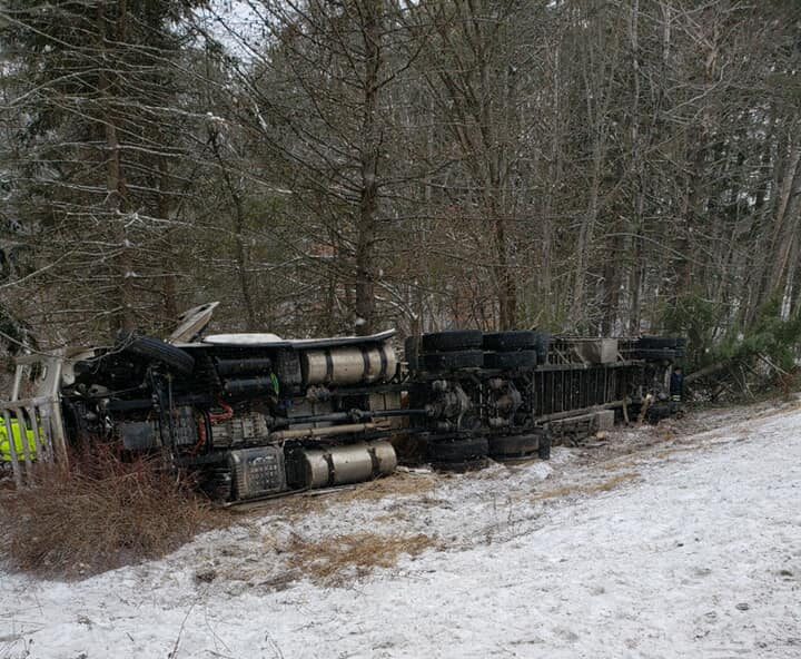 A tractor-trailer overturned Thursday afternoon on Route 9 in Chelsea, closing the roadway while rescue officials extricated two people from the cab. Photo courtesy of the Augusta Fire Department.