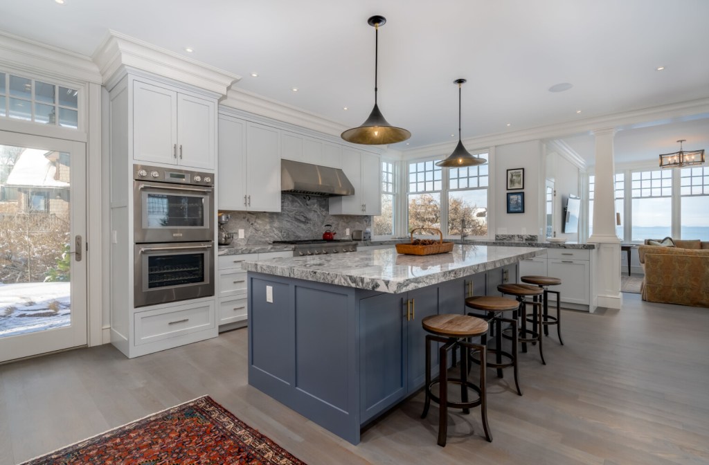 This home is the newest entry into Cousins Island-based architect Joseph Waltman’s portfolio, known for his creatively classic waterfront designs with fine details: sumptuous stones cover counters, light and hardware fixtures are unique yet timeless. Dorsey Construction of Freeport completed the shingle-style build with enduring skill. Landscape planning creates privacy between the home and its neighbors.