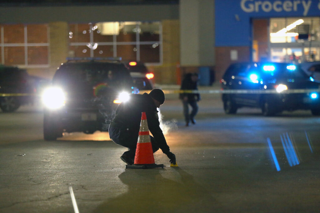 Police investigate the scene of a shooting on Feb. 14 in the parking lot outside Walmart in Scarborough. Ben McCanna/Staff Photographer