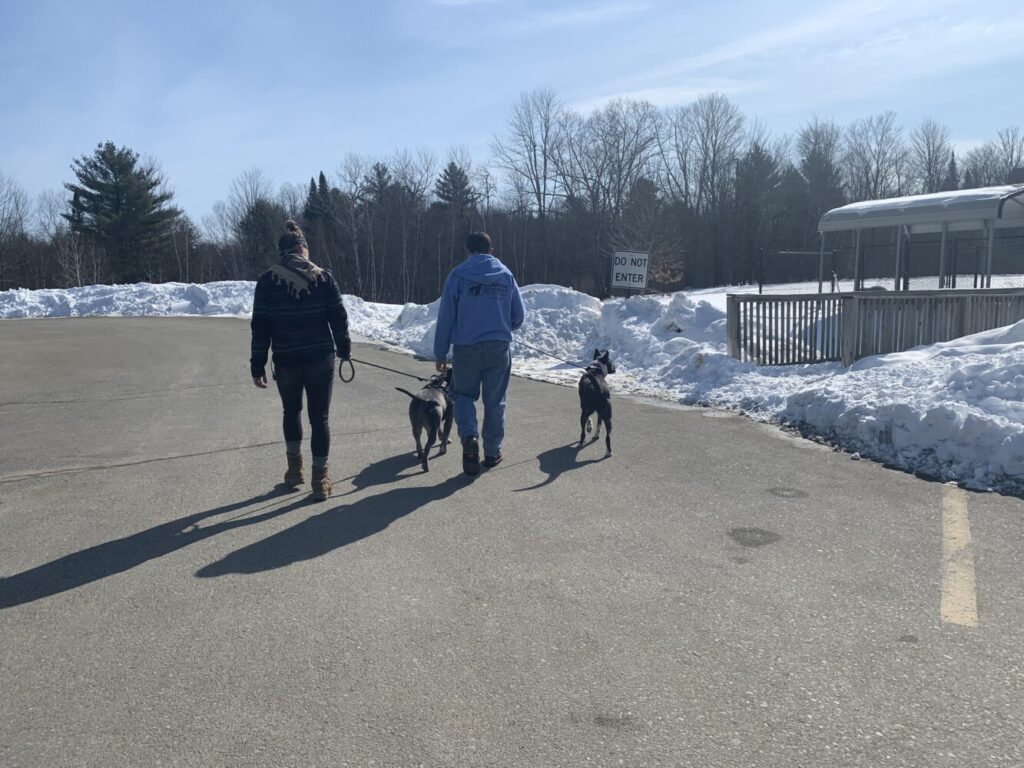 Ashley Babcock, left, and Ron Thompson, walk Opie and Paisley to see if the pair are a good match for an overnight stay. Morning Sentinel photo by Taylor Abbott