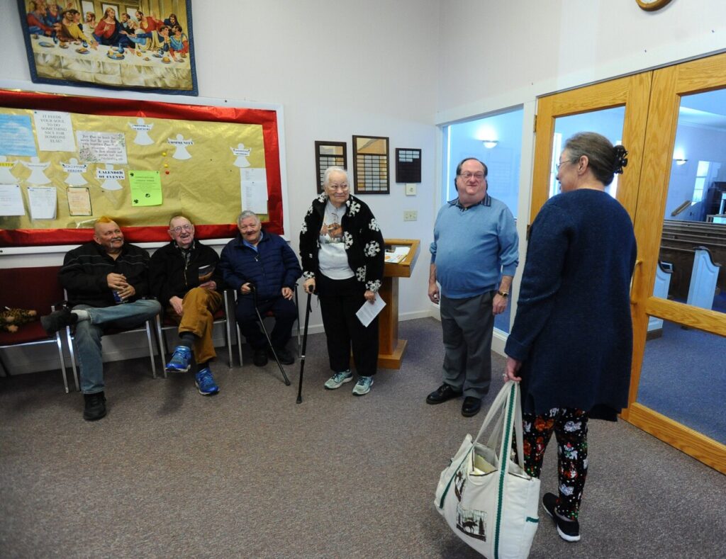 Pastor Nanci Greene, right, shares a light moment Sunday with congregation members before the start of the church service at First Congregational Church of Norridgewock. Morning Sentinel photo by Rich Abrahamson Buy this Photo