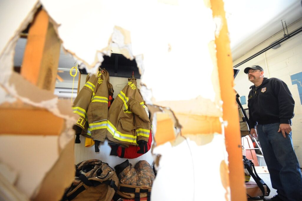 Oakland Fire Chief David Coughlin is pictured with gear in the locker room at the old Oakland Fire Department building in Oakland Sunday. Coughlin said the wall and doorway were widened to remove equipment. A larger locker room is part of the new building next door to the old station in Oakland. Morning Sentinel photo by Rich Abrahamson Buy this Photo
