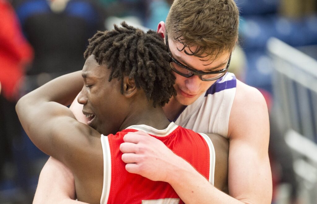 Cony senior guard Simon McCormick, front, is comforted by Hampden Academy senior Bryce Lausier after the Class A North championship game Friday night at the Augusta Civic Center. Morning Sentinel photo by Michael G. Seamans
