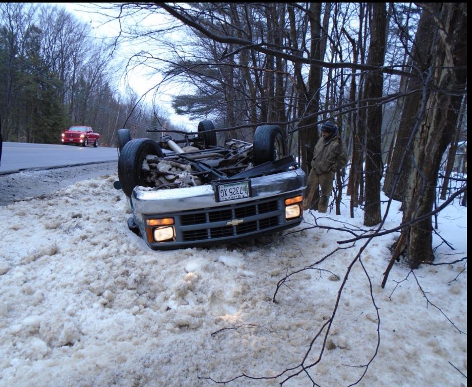 In Jay, Richard Hanson, 56, of Livermore Falls was traveling north on Route 133 in a 1996 Chevrolet pickup that slid on ice, spun 180 degrees, rolled over into a ditch and landed on its roof, Police Richard Caton IV said, according to officer Dan Demers’ report.