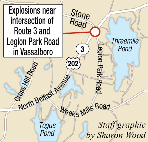 VASSALBORO — A two-bay garage at the corner of Route 3 and Legion Park Road was destroyed on Friday morning after a fire and multiple explosions caused it to collapse.