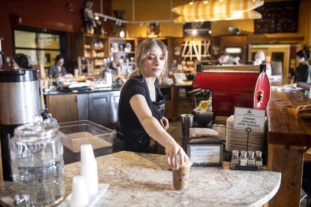 Barista Madison Watkins serves a drink in a disposable cup Friday at Coffee by Design in Portland. Coffee by Design has started serving all food and beverages using disposable cups and plates to prevent the spread of coronavirus. Brianna Soukup/Staff Photographer Buy this Photo