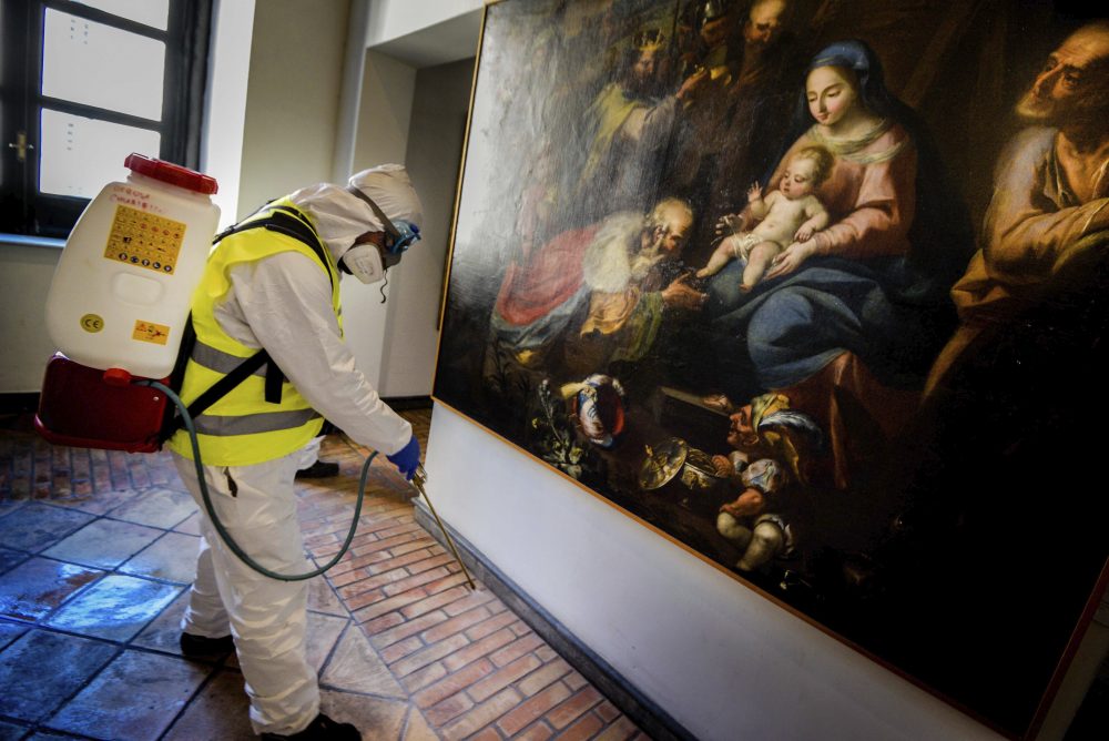 A worker sprays disinfectant as sanitization operations against Coronavirus are carried out in the museum hosted by the Maschio Angioino medieval castle, in Naples, Italy, Tuesday, March 10, 2020. (Alessandro Pone/LaPresse via AP)