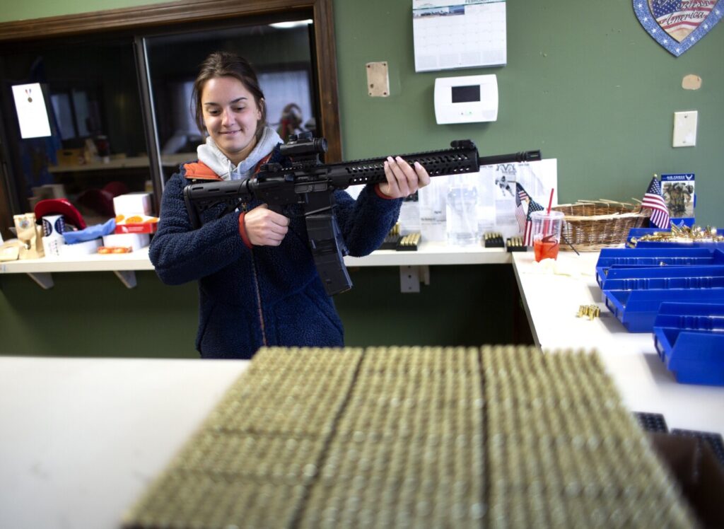 Emily Cooke stopped by Maine Ammo on Thursday morning to pick up ammunition for her husband, who owns a handgun and an AR-15 rifle. She said they normally buy online, but prices have skyrocketed lately, “and we’ve been discussing how we want to support local businesses anyway.”