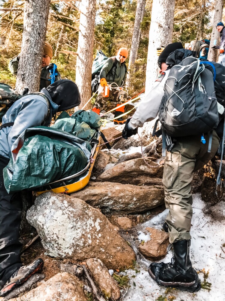 Emergency workers from the Maine Warden Service, Maine Forest Service, fire rescue departments from Phillips, Weld and Wilton, Mount Blue State Park and Franklin County Search and Rescue loaded Hutchinson into an emergency rescue toboggan and carried or pulled her down the icy, snow-covered terrain.