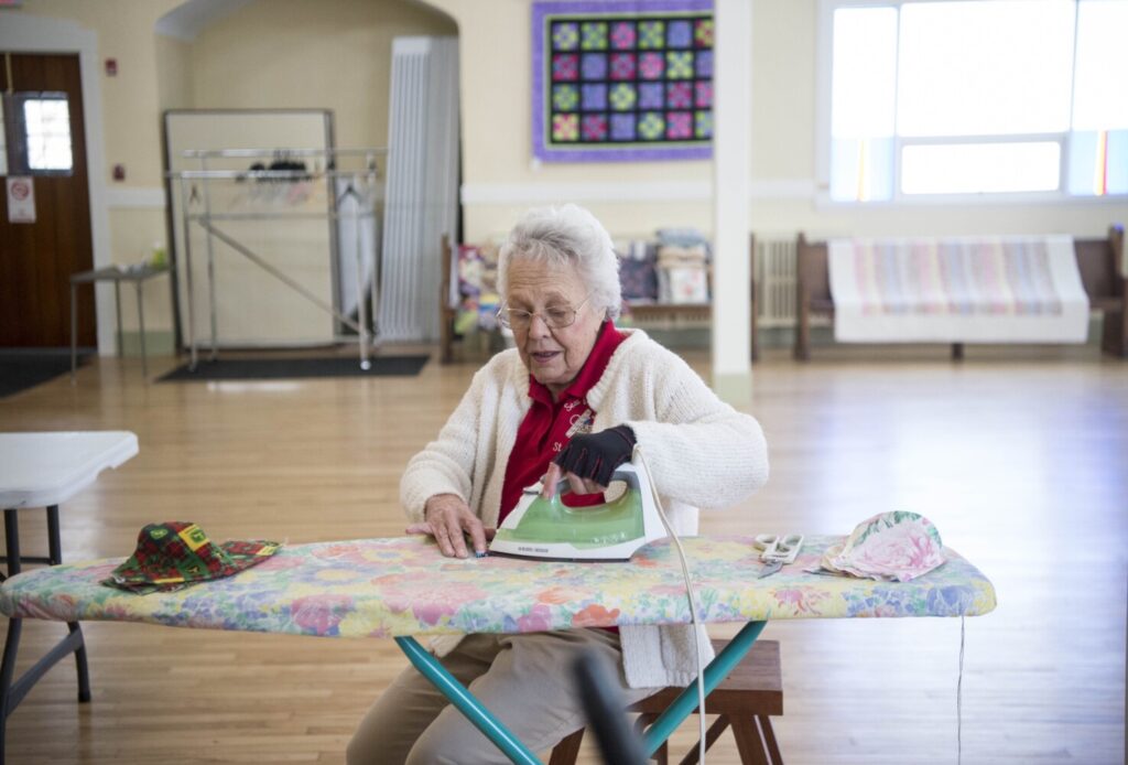 Rachel Kilbride crafts masks Tuesday for workers and others who may need them from extra material at St. Bridget Center in Vassalboro. Morning Sentinel photo by Michael G. Seamans