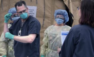 VA Maine Healthcare emergency room nurse Emily Fletcher, right, puts on gloves Tuesday before overseeing the removal of protective gear that doctors and nurses wore inside a tent erected at the campus to screen veterans for the coronavirus. Doctor Norman Guay, center, and nurse Jennifer Giarrizzo took off all protective gear and scrubbed down at the end of their shift in the tent. Kennebec Journal photo by Andy Molloy