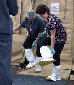 VA Maine Healthcare nurses Jennifer Giarrizzo, center, and Marie-Anne James remove protective gear they wore inside a tent erected at the campus to screen veterans for coronavirus. The hospital staff took off all protective gear and scrubbed down at the end of their shift in the tent. Kennebec Journal photo by Andy Molloy