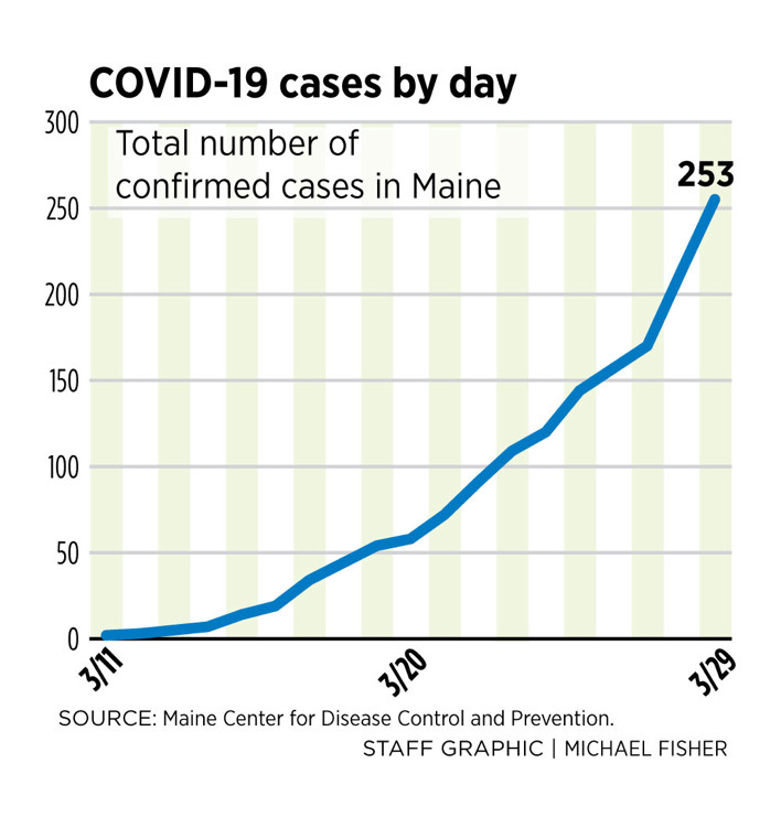 Somerset County saw its first confirmed case on Sunday. There were also 11 cases in Penobscot County, 10 in Kennebec, nine in Oxford, eight in Androscoggin, seven in Sagadahoc, five in Lincoln, four in Knox, and two each in Waldo and Franklin.