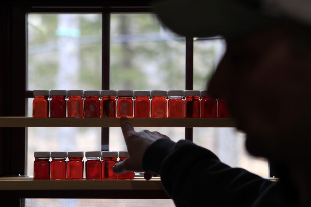 Scott Dunn shows a visitor the different grades of maple syrup produced this season at the Dunn Family Maple sugarhouse in Buxton on Wednesday. Maple syrup producers are dealing with several setbacks after the coronavirus outbreak, including the recent cancelation of Maple Syrup Sunday. Robert F. Bukaty/Associated Press