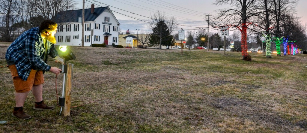 Kaleb Pushard poses for a portrait with the holiday lights, that he installed six months ago and was going to be taking down but has recently lit up again, on Saturday along Western Avenue in Manchester. He has fired them back along a normally busy stretch of U.S. Route 202 through Manchester, in hopes, he said, that they’ll bring back the same smiles they prompted on people passing through town when even more lights were up around Christmas. Kennebec Journal photo by Joe Phelan Buy this Photo