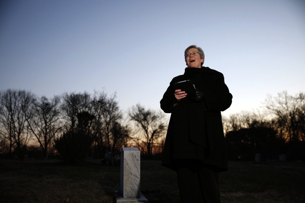 To an audience of early morning songbirds and a congregation of viewers on the other end of a livestream, Pastor Cindy Maddox of First Congregational Church, United Church of Christ, sang hymns and proclaimed that “Christ is risen.” Maddox performed the church’s traditional Easter sunrise service from a Highland Memorial Cemetery in South Portland. The yearly service is typically held in Fort Williams Park, to an audience of more than 100, but with the park being closed due to coronavirus and social distancing the new norm, Staff photo by Ben McCanna