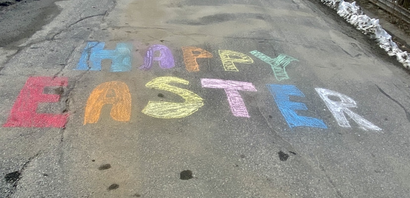 Hallowell Fire Chief James Owens, his wife Brenda Owens, stepdaughter Ashley Healey and granddaughter Madilynn Irish try to spread some Easter cheer Sunday for all their Farmingdale neighbors on Burke Street by building Mr. Bunny and writing an Easter message for all to see. Photo courtesy of Ashley Healey