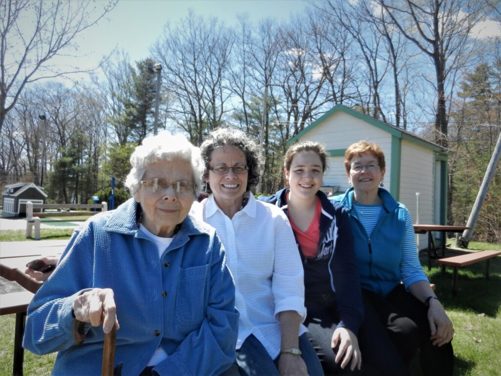 Esther Gyger, left, is shown in 2013 with, from left: her daughter, Sally Biggar, her granddaughter, Sally Littlefield, and daughter, Martha Littlefield. Gyger died on April 5 – not because of COVID-19, but as Martha Littlefield says: “COVID19 definitely impacted the last month of her life.” Photo courtesy of Martha Littlefield
