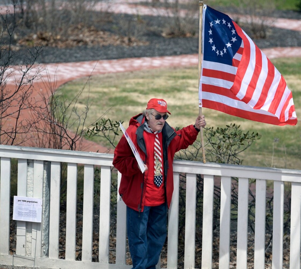 “I think what we’ve got is a huge overreach” by primarily state government, said protester Carl Brando, a self-employed contractor from Eddington, who said he is not working now because people are scared to have anyone around them amid the coronavirus.