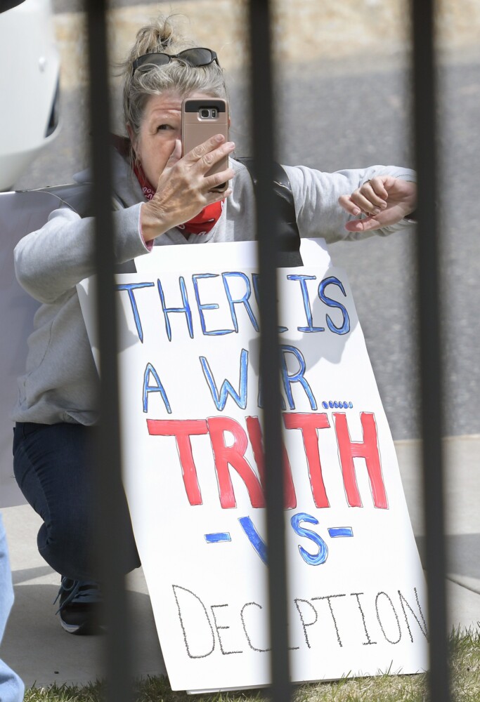 A protester with a sign takes photos Monday outside the State House Augusta, where hundreds of people gathered to call for coronavirus restrictions to be lifted. Kennebec Journal photo by Andy Molloy