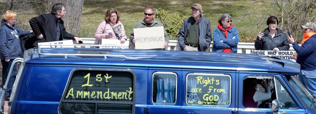 The raucous protest went on for more than an hour. Protester Kit McCall of Hermon, who wore a protective mask at the event, said he was “not at all” concerned he could be exposed to the coronavirus at the event, because he and others would take precautions. He said he is concerned small businesses are being unfairly affected by the state’s rules, while larger businesses, like Walmart, sell some of the same items and are allowed to remain open.