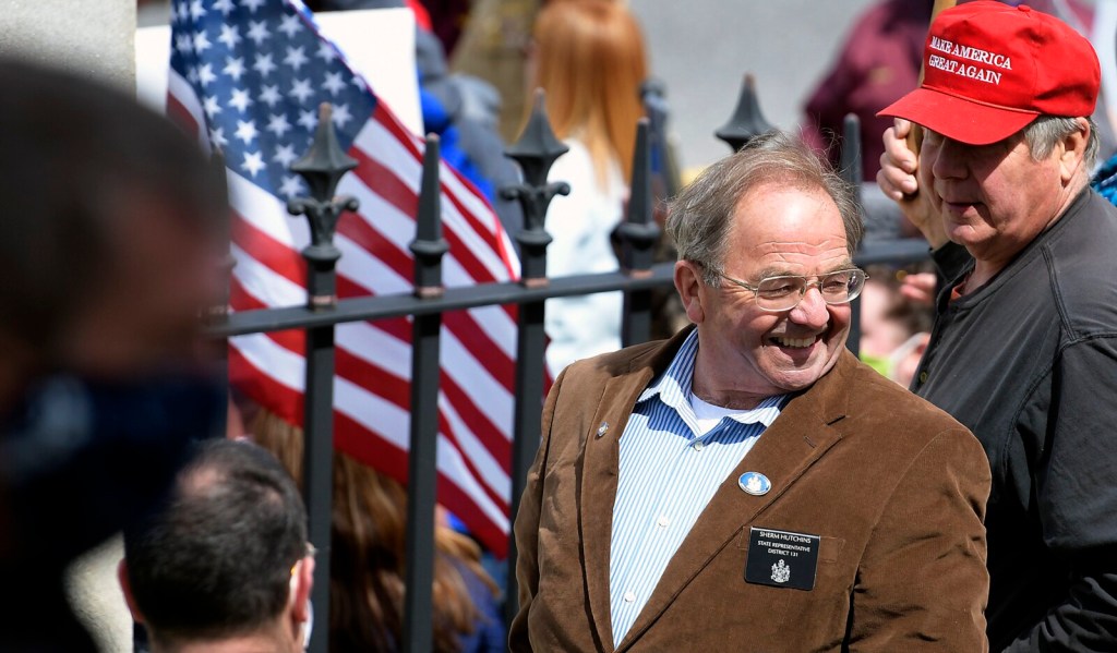 State Rep. Sherm Hutchins, R-Penobscot, grins Monday outside the State House Augusta, where hundreds of protesters gathered to call for coronavirus restrictions to be lifted. Kennebec Journal photo by Andy Molloy