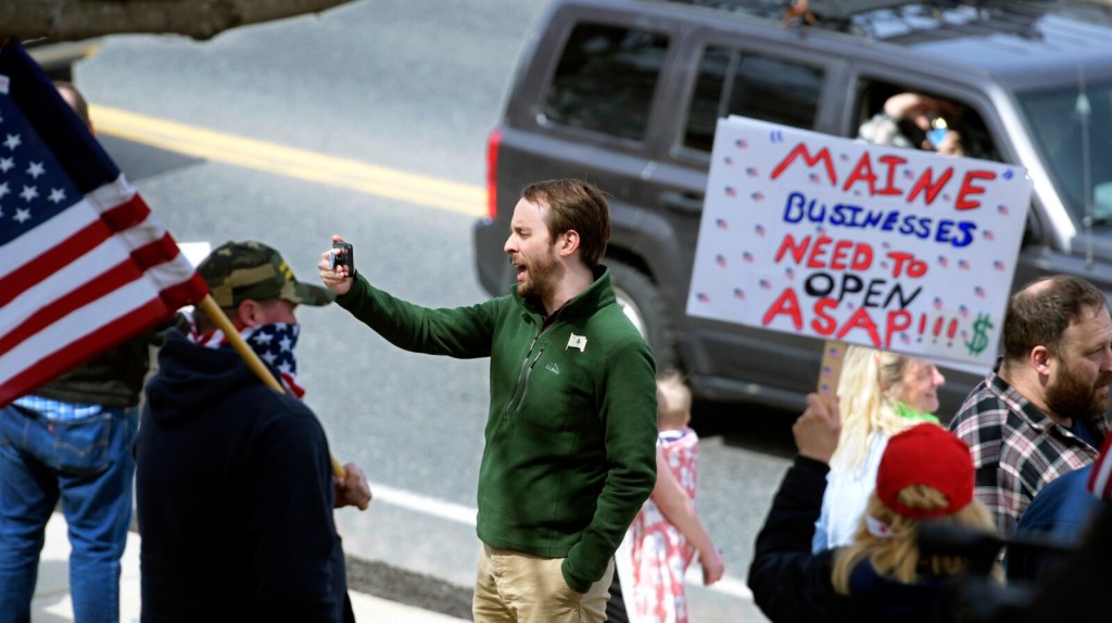 Nearby, another man yelled: “I need a haircut. Let my barber open.” His words were in reference to barbers not being considered an essential service allowed to remain open in Maine during the pandemic.