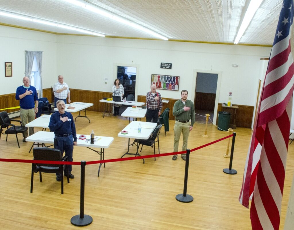 The Windsor Board of Selectmen starts its meeting Tuesday with the Pledge Of Allegiance at the Town Hall. Kennebec Journal photo by Joe Phelan Buy this Photo
