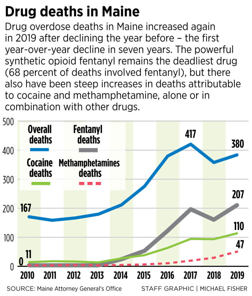 According to a report released Friday by the Maine Attorney General’s Office, 380 people died last year from a drug overdose, up 7 percent from the 354 deaths in 2018. Before that, overdose deaths had increased every year from 2011 through 2017 – topping out at 417. Over the last five years, 1,799 people have died, an average of almost one every day.