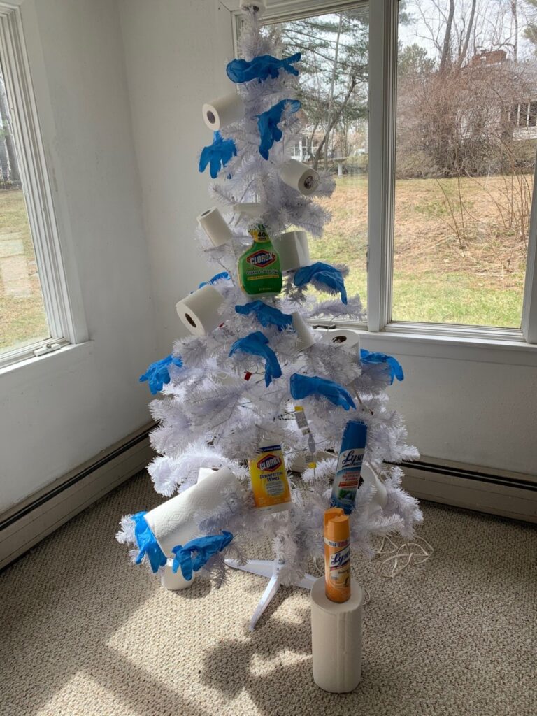 Family gifts will include gaily wrapped 20-roll packages of toilet paper, bottles of disinfectant, stockings jammed with packs of wipes, Kleenex, boxes of bright blue Nitrile Exam Gloves (you can arrange them as ornaments) and assorted face masks.