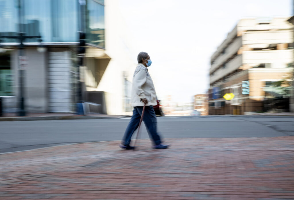 A woman walks on a largely deserted Congress Street in Portland on Monday morning. Derek Davis/Staff Photographer