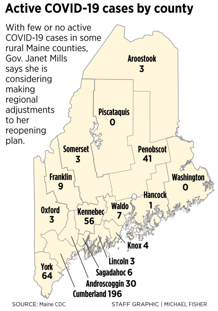 Mills also said she would consider looking at quicker reopenings in areas with very few cases of COVID-19, such as rural areas of Maine.