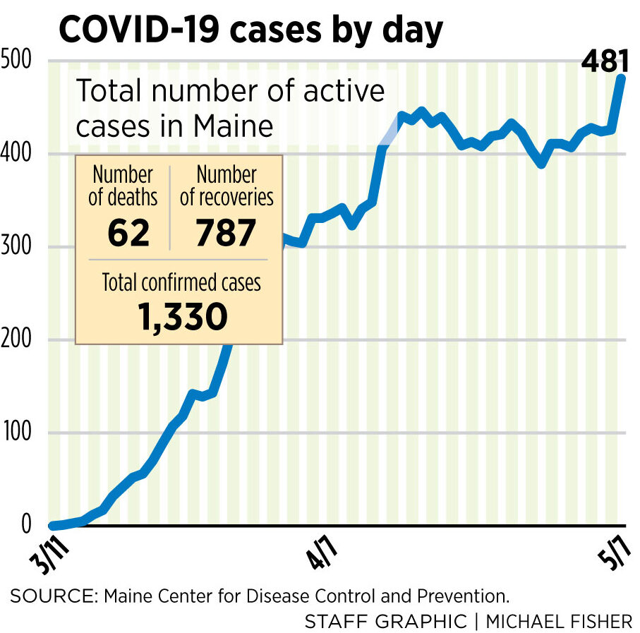 Maine now has 481 active cases, which is the number of total cases minus those who have recovered or died. That’s the highest total to date, eclipsing the previous peak of 446 cases on April 17. Public health experts agree that a decline in cases for at least two weeks is one of the most important criteria for determining whether it is safe to begin reopening the economy.