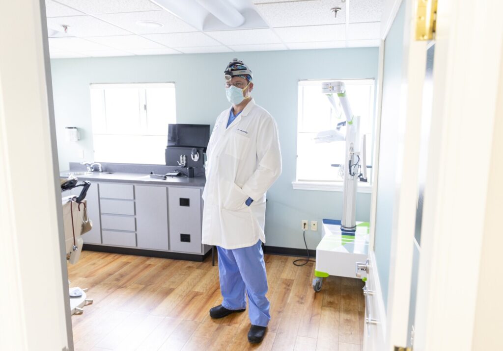 Dr. Killian MacCarthy stands in his office in South Portland on Monday. MacCarthy, an oral surgeon, said he has seen more deep infections that come from a lack of routine dental care during the pandemic. Brianna Soukup/Staff Photographer