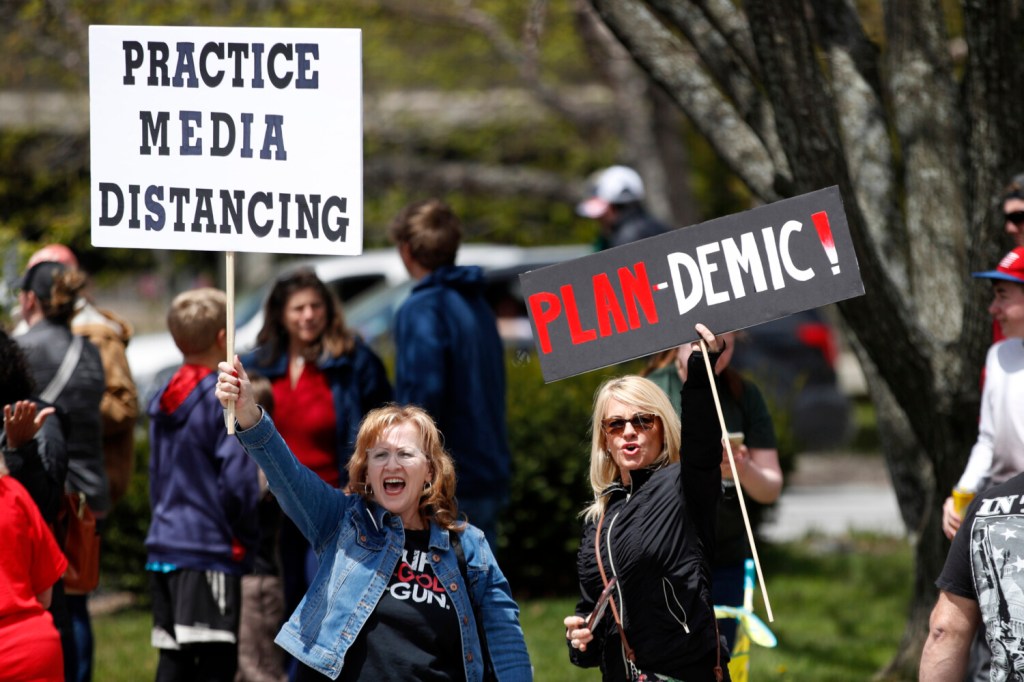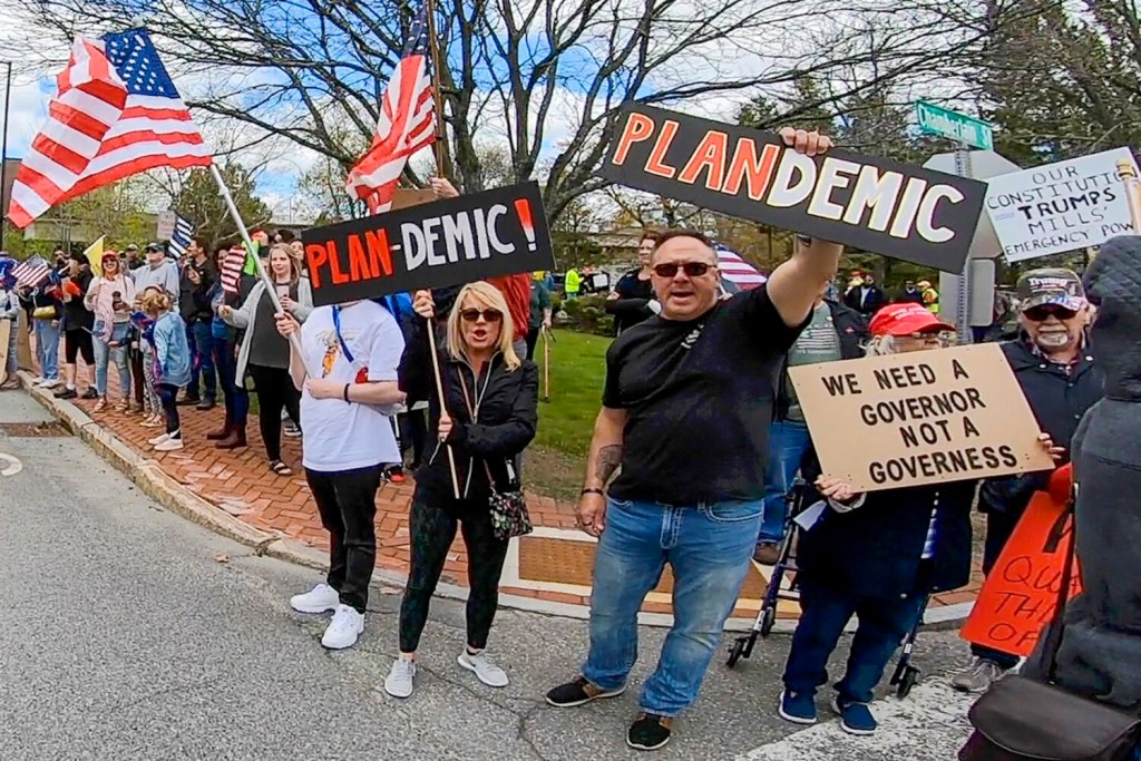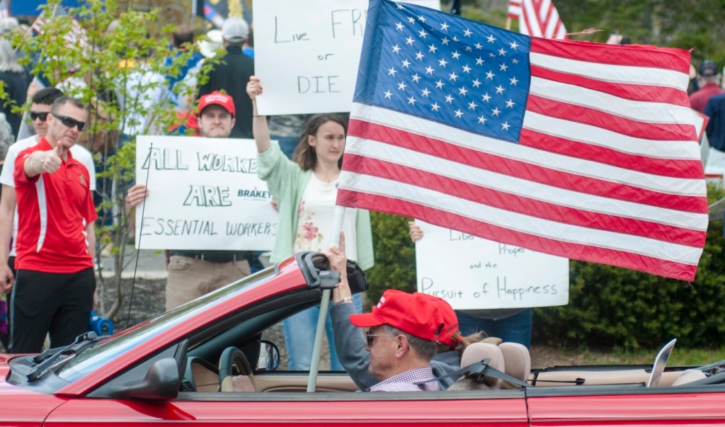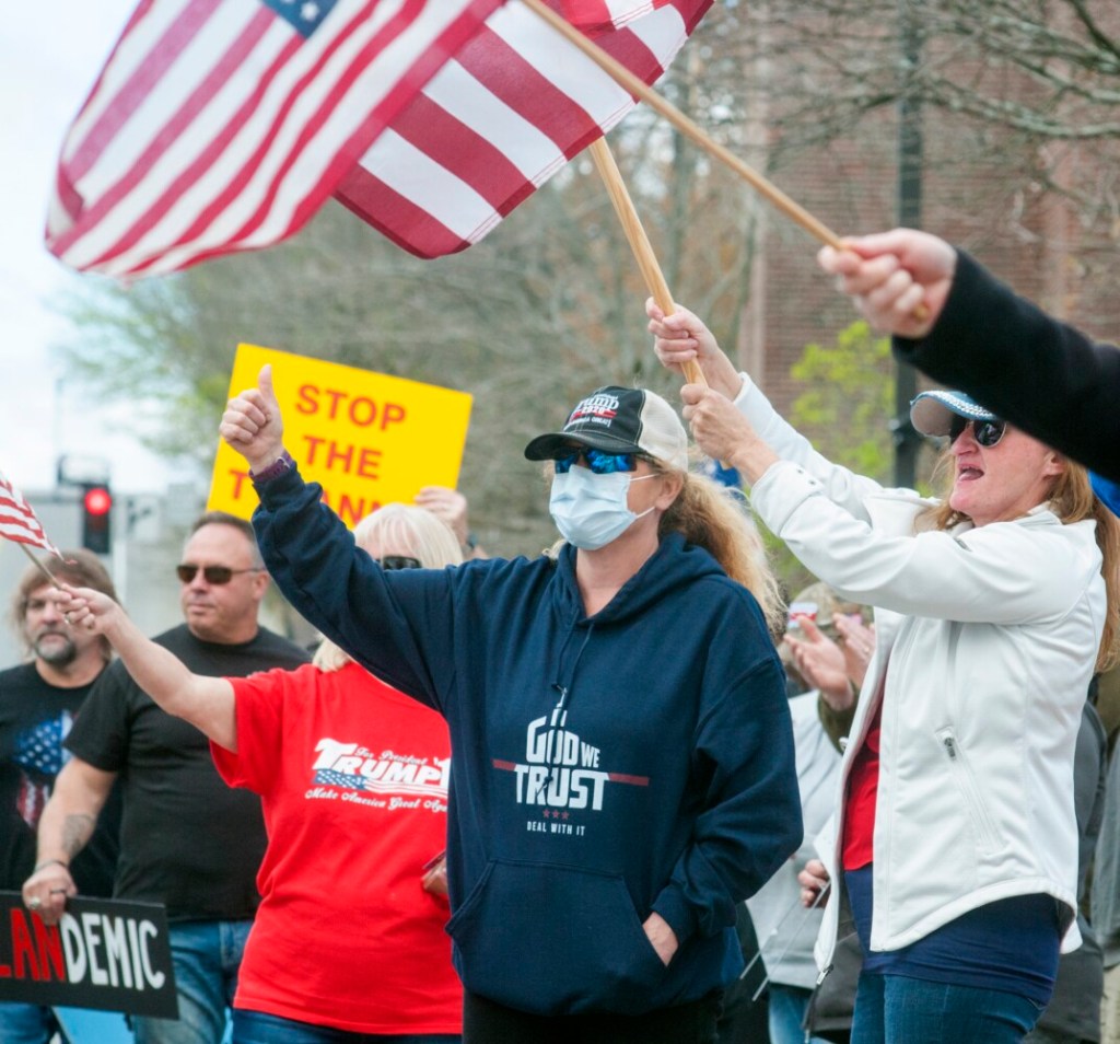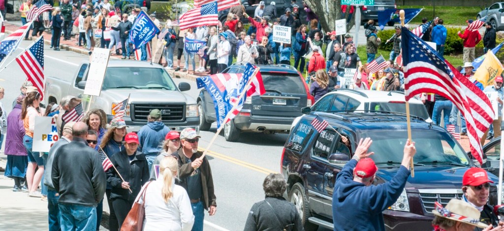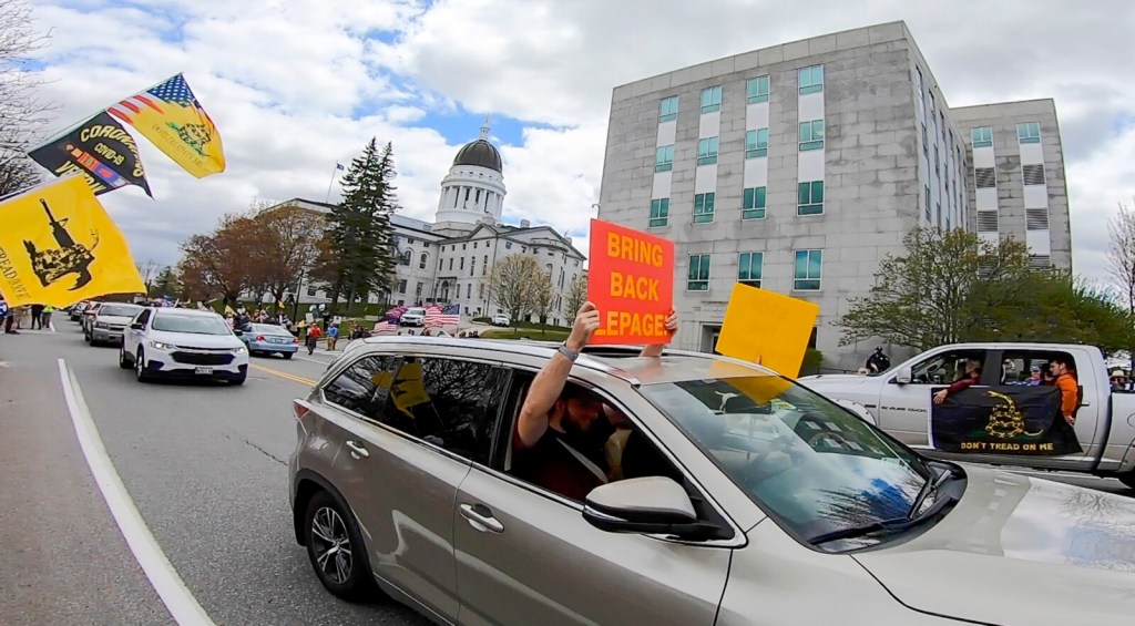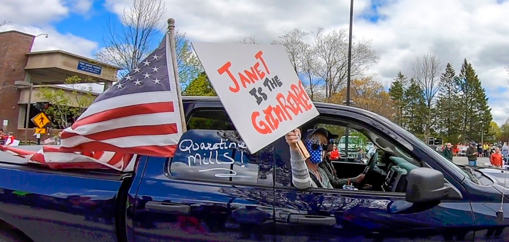 People holding signs accusing Democratic Gov. Janet Mills of ruining the economy and taking away their freedoms lined the road between the Blaine House and the State House, while a motorcade of honking cars and trucks adorned with American flags and Trump campaign signs passed by.