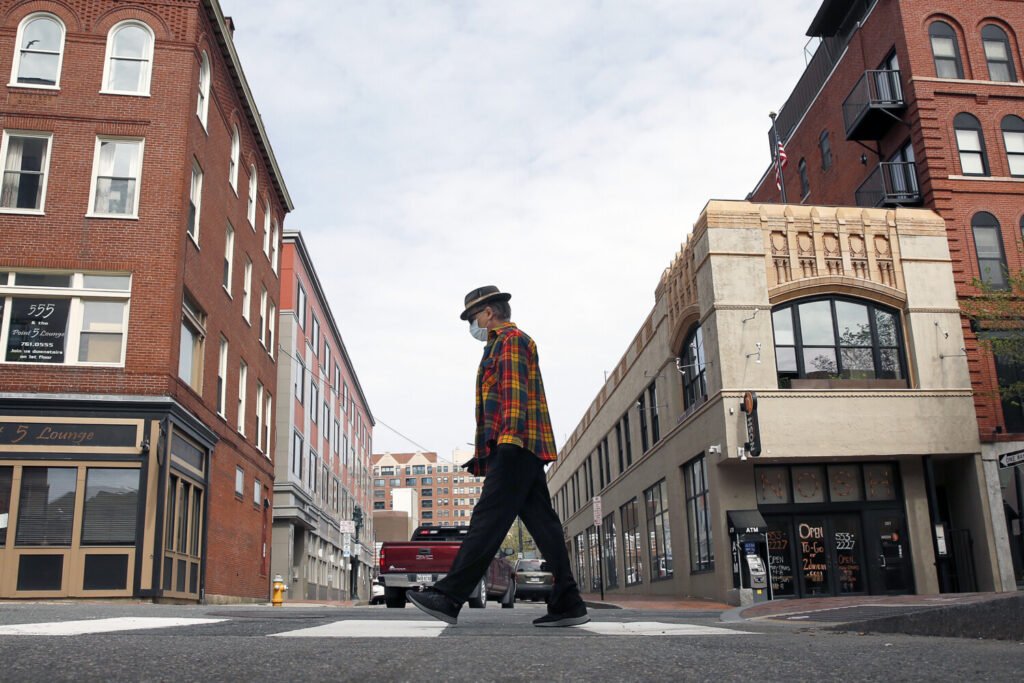 As the state has begun loosening its restrictions and businesses have begun reopening, people like this man crossing Oak Street in Portland have begun to venture out. Though the state has tripled its testing capacity, the Maine CDC is still recommending that people wear masks in situations where physical distancing isn’t possible. Ben McCanna/Staff Photographer