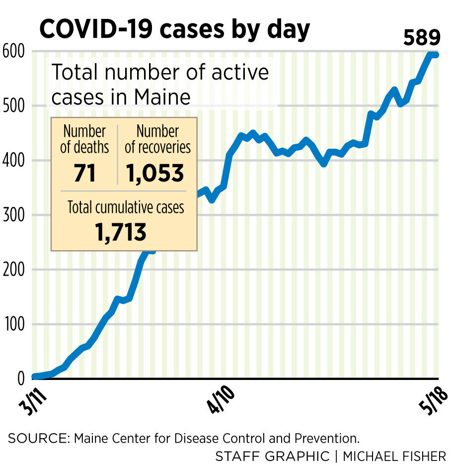 After accounting for the 71 deaths and the 1,053 people who have recovered from the disease, there were 589 active cases of COVID-19 in the state. That is the same number of active cases as Sunday. Even so, Maine CDC data show that the number of active cases in the state continues to trend upward, with the seven-day average for the week ending Monday standing at 547 compared to an average of 476 for the week ending May 11.