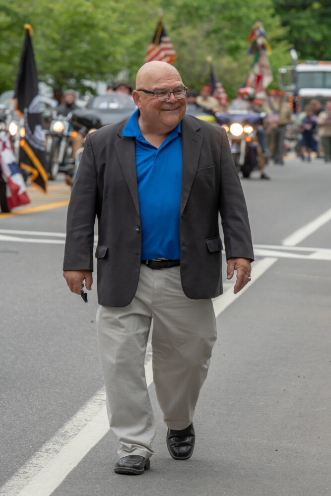 Longtime Mt. Ararat High School band director Allen Graffam walks with his marching band in the 2018 Brunswick Topsham Memorial Day shortly before retiring. Teri Schultz photo