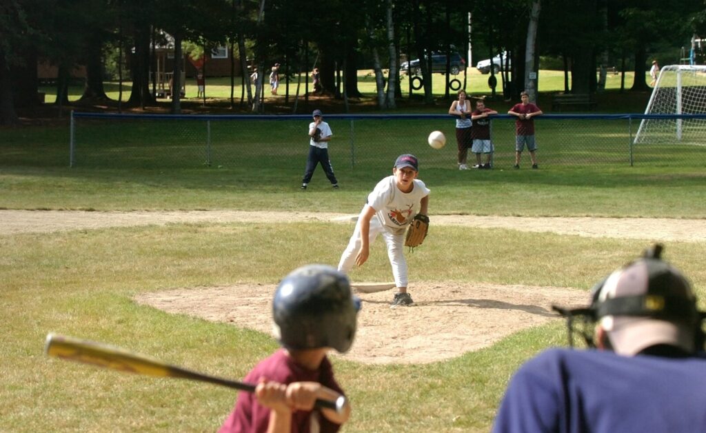 Competitions between camps are also canceled. Here Camp Caribou’s Zach Brandeis, 11, pitches to a Camp Manitou batter during a game in Winslow in 2007. Morning Sentinel file
